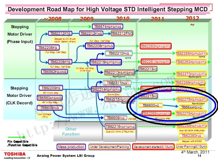 東芝推出了高壓大電流步進(jìn)電機(jī)驅(qū)動芯片TB6600,此芯片高達(dá)50V耐壓和5A電流,目前此芯片已進(jìn)入量產(chǎn)階段 但是有一點疑問,東芝官方給出的芯片手冊型號為TB6600HQ(以下稱為HQ),但芯片上面的型號卻為TB6600HG(以下稱為HG),到底這兩款芯片有什么區(qū)別和相同點,甚至于是否就是同一款芯片呢?步進(jìn)電機(jī)網(wǎng)實驗室做了詳細(xì)的調(diào)研: 以時間順序 1.最早露面的芯片簡介為HQ