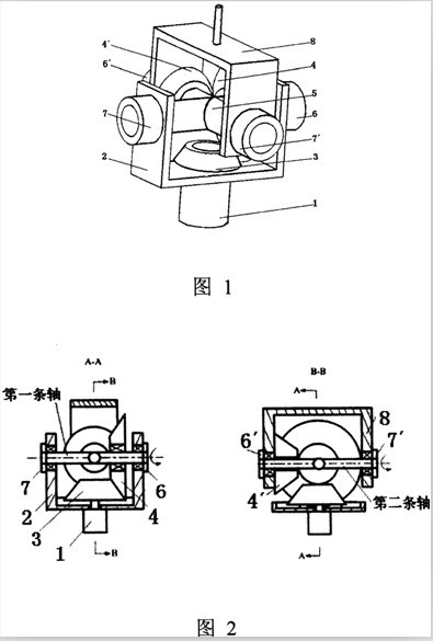 本發(fā)明公開了一種單電機(jī)驅(qū)動(dòng)的兩自由度關(guān)節(jié)結(jié)構(gòu),該結(jié)構(gòu)由電機(jī)(1)、機(jī)架(2)、電機(jī)齒輪(3)、第一齒輪(4)、第二齒輪(4’)、十字形交叉軸(5)、第一角位移傳感器(6)、第二角位移傳感器(6’)、第一磁流變體阻尼器(7)、第二磁流變體阻尼器(7’)和執(zhí)行部件(8)構(gòu)成。 利用本發(fā)明,通過對(duì)兩個(gè)軸端可控磁流變體阻尼器輸出阻尼力矩的控制,實(shí)現(xiàn)了單電機(jī)對(duì)兩個(gè)自由度運(yùn)動(dòng)的控制。 1、一種單電機(jī)驅(qū)動(dòng)的兩自由度關(guān)節(jié)結(jié)構(gòu),其特征在于,該結(jié)構(gòu)由電機(jī)(1)、機(jī)架(2)、電機(jī)齒輪(3)、第一齒輪(4)、第二齒輪(4,)、十字形交叉軸(5)、第一角位移傳感器(6)、第二角位移傳感器(6’)、第一磁流變體阻尼器(7)、第二磁流變體阻尼器(7’)和執(zhí)行部件(8)構(gòu)成;其中,機(jī)架(2)與執(zhí)行部件(8)通過十字形交叉軸(5)相聯(lián)接,機(jī)架(2)與該十字形交叉軸(5)的第一條軸通過軸承相聯(lián)接,執(zhí)行部件(8)與該十字形交叉軸(5)的第二條軸通過軸承相聯(lián)接;電機(jī)(1)固定安裝于機(jī)架(2)上,電機(jī)齒輪(3)與電機(jī)(1)的輸出轉(zhuǎn)軸固定聯(lián)接,電機(jī)齒輪(3)所在平面平行于所述十字形交叉軸(5)的第一條軸,電機(jī)齒輪(3)的軸線延長(zhǎng)線通過十字形交叉軸(5)的中心點(diǎn);第一齒輪(4)與所述十字形交叉軸(5)的第一條軸以軸承相聯(lián)接,第二齒輪(4’)與所述執(zhí)行部件(8)為固定聯(lián)接,使電機(jī)齒輪(3)與第一齒輪(4)相嚙合,且第一齒輪(4)與第二齒輪(4’)相嚙合;所述十字形交叉軸(5)的第一條軸的兩端分別安裝有第一角位移傳感器(6)和第一磁流變體阻尼器(7),所述十字形交叉軸(5)的第二條軸的兩端分別安裝有第二角位移傳感器(6’)和第二磁流變體阻尼器(7’)。 2、根據(jù)權(quán)利要求1所述的單電機(jī)驅(qū)動(dòng)的兩自由度關(guān)節(jié)結(jié)構(gòu),其特征在于,所述第一齒輪(4)與十字形交叉軸(5)以軸承方式相聯(lián)接,該兩自由度關(guān)節(jié)繞第一軸線的輸出運(yùn)動(dòng)并不同于第一齒輪(4)繞十字形交叉軸(5)第一條軸的運(yùn)動(dòng)。 3、根據(jù)權(quán)利要求1所述的單電機(jī)驅(qū)動(dòng)的兩自由度關(guān)節(jié)結(jié)構(gòu),其特征在于,所述第二齒輪(4’)與執(zhí)行部件(8)為固定聯(lián)接,該兩自由度關(guān)節(jié)繞第二軸線的輸出運(yùn)動(dòng)相同于第二齒輪(4’)繞十字形交叉軸第二條軸的運(yùn)動(dòng)。 4、根據(jù)權(quán)利要求1所述的單電機(jī)驅(qū)動(dòng)的兩自由度關(guān)節(jié)結(jié)構(gòu),其特 征在于,所述第一角位移傳感器(6)用于反映該兩自由度關(guān)節(jié)繞第一軸線的轉(zhuǎn)角,所述第二角位移傳感器(6’)用于反映該兩自由度關(guān)節(jié)繞第二軸線的轉(zhuǎn)角,角位移傳感器(6)和(6’)用于對(duì)兩自由度關(guān)節(jié)運(yùn)動(dòng)的反饋控制。 5、根據(jù)權(quán)利要求1所述的單電機(jī)驅(qū)動(dòng)的兩自由度關(guān)節(jié)結(jié)構(gòu),其特征在于,所述第一磁流變阻尼器固定聯(lián)接于所述機(jī)架(2)上,所述第二磁流變阻尼器固定聯(lián)接于執(zhí)行部件(8)上,通過對(duì)兩個(gè)軸端阻尼器輸出阻尼的控制,實(shí)現(xiàn)單電機(jī)對(duì)兩個(gè)自由度的可控驅(qū)動(dòng)。 6、根據(jù)權(quán)利要求l所述的單電機(jī)驅(qū)動(dòng)的兩自由度關(guān)節(jié)結(jié)構(gòu),其特征在于,所述執(zhí)行部件(8)繞所述十字形交叉軸(5)的兩條軸所在直線的運(yùn)動(dòng)是這樣形成的:執(zhí)行部件(8)、第二齒輪(4’)以及十字形交叉軸(5)整體繞第一軸線轉(zhuǎn)動(dòng),執(zhí)行部件(8)和第二齒輪(4’)繞第二軸線轉(zhuǎn)動(dòng)。 單電機(jī)驅(qū)動(dòng)的兩自由度關(guān)節(jié)結(jié)構(gòu)技術(shù)領(lǐng)域本發(fā)明涉及仿生機(jī)器人技術(shù)領(lǐng)域,尤其涉及一種應(yīng)用于仿生機(jī)器人的單電機(jī)驅(qū)動(dòng)的兩自由度關(guān)節(jié)結(jié)構(gòu)。 背景技術(shù)兩自由度關(guān)節(jié)指具有兩個(gè)軸線垂直相交自由度的關(guān)節(jié),這種關(guān)節(jié)的原型在人體和動(dòng)物體上普遍存在,研制兩自由度關(guān)節(jié)對(duì)各種仿生機(jī)器人具有一定的意義。 在自然界,具有2至3個(gè)軸線垂直相交自由度的關(guān)節(jié)在各種動(dòng)物體上極為常見,比如人體和其他行走類動(dòng)物的頸關(guān)節(jié)、腕關(guān)節(jié)、踝關(guān)節(jié)、指根關(guān)節(jié)、腰關(guān)節(jié),螃蟹和其他爬行類動(dòng)物的腿根關(guān)節(jié)等。因此,對(duì)于各種仿生機(jī)器人,如何制作具有軸線相交自由度的關(guān)節(jié)是需要解決的問題之一。 一般情況下,2至3自由度關(guān)節(jié)的驅(qū)動(dòng)都是采用的全驅(qū)動(dòng)方式,即驅(qū)動(dòng)電機(jī)數(shù)與關(guān)節(jié)的自由度數(shù)是相等的,這樣常常會(huì)給電機(jī)的布置帶來(lái)麻煩。如果能實(shí)現(xiàn)單電機(jī)驅(qū)動(dòng)的兩自由度關(guān)節(jié),可以一定程度上方便機(jī)器人的設(shè)計(jì)。 發(fā)明內(nèi)容(一)要解決的技術(shù)問題有鑒于此,本發(fā)明的主要目的在于提供一種單電機(jī)驅