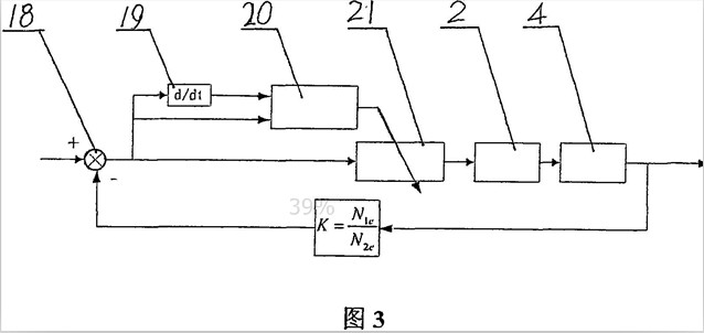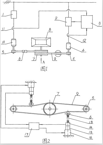 雙電機(jī)驅(qū)動(dòng)立軸式?jīng)_擊破碎機(jī)的功率平衡調(diào)節(jié)方法及裝置 本發(fā)明公開(kāi)了一種雙電機(jī)驅(qū)動(dòng)立軸式?jīng)_擊破碎機(jī)的功率平衡調(diào)節(jié)方法及裝置,屬于破碎機(jī)械;旨在提供一種雙電機(jī)驅(qū)動(dòng)負(fù)載的功率平衡調(diào)節(jié)方法及裝置。其方法包括數(shù)據(jù)采集、數(shù)據(jù)處理、調(diào)節(jié)控制;數(shù)據(jù)采集包括電機(jī)的電流以及傳動(dòng)皮帶的張緊力采集,數(shù)據(jù)處理包括計(jì)算兩臺(tái)電機(jī)功率的偏差率以及傳動(dòng)皮帶張緊力的誤差,調(diào)節(jié)控制包括從電機(jī)的轉(zhuǎn)速和步進(jìn)電機(jī)的轉(zhuǎn)速調(diào)節(jié);其裝置包括破碎機(jī)、皮帶輪以及電機(jī);主電機(jī)(1O)通過(guò)第一電流傳感器(11)與市電連接,從電機(jī)(4)通過(guò)第二電流傳感器(12)、變頻器(2)與市電連接,變頻器(2)以及兩電流傳感器與功率平衡控制器(3)電連接。本發(fā)明可廣泛用于采礦、水利和水泥等行業(yè)。 1.一種雙電機(jī)驅(qū)動(dòng)立軸式?jīng)_擊破碎機(jī)的功率平衡調(diào)節(jié)方法,包括數(shù)據(jù)采集、數(shù)據(jù)處理、調(diào)節(jié)控制;其特征在于具體方法如下:1)數(shù)據(jù)采集,對(duì)主電機(jī)和從電機(jī)錠子一側(cè)的電流進(jìn)行采集,與此同時(shí)對(duì)兩臺(tái)電機(jī)傳動(dòng)皮帶松弛邊的張緊力進(jìn)行采集;2)數(shù)據(jù)處理,以上述電流分別作為兩臺(tái)電機(jī)實(shí)際功率的近似值計(jì)算出兩臺(tái)電機(jī)功率的偏差率,與此同時(shí)計(jì)算出兩臺(tái)電機(jī)傳動(dòng)皮帶張緊力的誤差;3)調(diào)節(jié)控制,通過(guò)變頻器調(diào)節(jié)從電機(jī)的轉(zhuǎn)速,使其跟隨主電機(jī)的機(jī)械特性保持兩電機(jī)功率平衡;與此同時(shí),調(diào)節(jié)兩傳動(dòng)皮帶的張緊力,直到兩條傳動(dòng)皮帶的張緊力趨于一致。 2.一種實(shí)現(xiàn)權(quán)利要求1所述的雙電機(jī)驅(qū)動(dòng)立軸式?jīng)_擊破碎機(jī)的功率平衡調(diào)節(jié)方法的裝置,包括破碎機(jī)、安裝在該破碎機(jī)上的大皮帶輪、分別通過(guò)小皮帶輪和傳動(dòng)皮帶共同帶動(dòng)大皮帶輪轉(zhuǎn)動(dòng)的兩臺(tái)電機(jī);其特征在于:主電機(jī)(10)通過(guò)第一電流傳感器(11)與市電連接,從電機(jī)(4)通過(guò)第二電流傳感器(12)、變頻器(2)與市電連接,變頻器(2)以及上述兩電流傳感器分別與功率平衡控制器(3)電連接;在兩條傳動(dòng)皮帶(9)的松弛邊各設(shè)有一套由步進(jìn)電機(jī)(16)、與該電機(jī)連接的調(diào)節(jié)裝置(15)、設(shè)置在步進(jìn)電機(jī)(16)上的測(cè)量裝置(14)、通過(guò)彈簧(13)與調(diào)節(jié)裝置(15)連接的張緊輪(6)構(gòu)成的張力調(diào)節(jié)機(jī)構(gòu),兩套所述的張力調(diào)節(jié)機(jī)構(gòu)之間通過(guò)張力控制器(17)電連接。 3.根據(jù)權(quán)利要求2所述的裝置,其特征在于:在第一電流傳感器(11)的前端設(shè)有軟啟動(dòng)器(1)。 雙電機(jī)驅(qū)動(dòng)立軸式?jīng)_擊破碎機(jī)的功率平衡調(diào)節(jié)方法及裝置技術(shù)領(lǐng)域:本發(fā)明涉及一種雙電機(jī)驅(qū)動(dòng)負(fù)載的功率平衡調(diào)節(jié)方法,尤其涉及一種雙電機(jī)驅(qū)動(dòng)立軸式?jīng)_擊破碎機(jī)的功率平衡調(diào)節(jié)方法;本發(fā)明還涉及一種實(shí)現(xiàn)該方法的裝置。 背景技術(shù):立軸式?jīng)_擊破碎機(jī)是破碎機(jī)械中一種新型的破碎設(shè)備,它具有能耗低、磨損件少、重量輕等特點(diǎn);近年來(lái),隨著“多破少磨”破磨理論的發(fā)展,立軸式?jīng)_擊破碎機(jī)在采礦、水利和水泥等行業(yè)得到了越來(lái)越廣泛的應(yīng)用。立軸式?jīng)_擊破碎機(jī)的驅(qū)動(dòng)形式主要有單電機(jī)驅(qū)動(dòng)和雙電機(jī)驅(qū)動(dòng)兩種,電機(jī)與負(fù)載之間采用皮帶傳動(dòng)。目前,雙電機(jī)驅(qū)動(dòng)的立軸式?jīng)_擊破碎機(jī)普遍沒(méi)有安裝功率平衡系統(tǒng),主要存在以下問(wèn)題: 1.功率不平衡,即便是型號(hào)完全一樣的兩臺(tái)電機(jī),由于制造上的原因,其機(jī)械特性往往也不完全相同。功率不平衡所造成的直接后果就是其中一臺(tái)電機(jī)容易產(chǎn)生過(guò)熱,而另一臺(tái)負(fù)載不足、功率沒(méi)有得到充分的發(fā)揮,從而導(dǎo)致機(jī)械設(shè)備工作效率低,電機(jī)使用壽命短,嚴(yán)重時(shí)還會(huì)造成電機(jī)燒毀。 2.兩條皮帶張緊程度不一致會(huì)加大兩臺(tái)電機(jī)之間已經(jīng)存在的功率不平衡程度。 目前,在雙電機(jī)驅(qū)動(dòng)的立軸式?jīng)_擊破碎機(jī)生產(chǎn)過(guò)程中,主要采取電機(jī)匹配的方法來(lái)解決上述問(wèn)題,即盡量使同功率的兩臺(tái)電機(jī)具有接近的額定轉(zhuǎn)速;但這種方法不僅費(fèi)工、費(fèi)時(shí),效果也不理想;而且還存在電機(jī)可互換性差等缺陷。 發(fā)明內(nèi)容:針對(duì)現(xiàn)有技術(shù)中存在的上述缺陷,本發(fā)明旨在提供一種雙電機(jī)驅(qū)動(dòng)立軸式?jīng)_擊破碎機(jī)的功率平衡調(diào)節(jié)方法,它可實(shí)現(xiàn)共同驅(qū)動(dòng)負(fù)載的兩臺(tái)電機(jī)能夠根據(jù)各自的額定功率等比例出力;本發(f