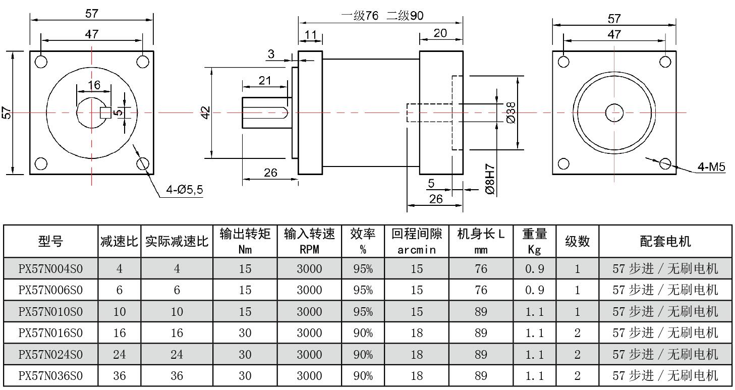 我公司生產(chǎn)的減速機(jī)可分兩種 普通的也就是PX系列的 超高精密的是PL系列 以PX57N036S0為例減速比為1:36,輸出扭矩為0.7*36*0.8效率=20.16NM,輸入轉(zhuǎn)速為3000rpm,精度會(huì)在20弧分左右。可配57系列步進(jìn)/無刷電機(jī)使用。
