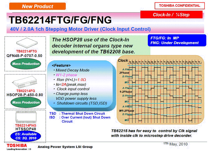 TB62214FG(1/4細分,2.0A)(應用于普通紙復印機,掃描儀,縫紉機,傳真機,打印機,機器人,讀卡器等),這款****推出的芯片性價比很高,將逐步替代tb62209fg